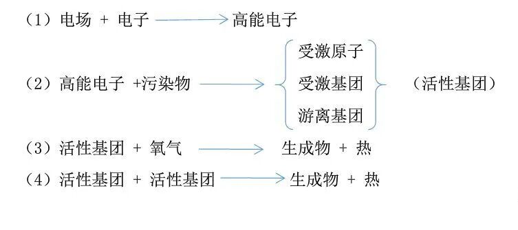 从以上反应过程中可以看出,电子先从电场获得能量,通过激发将电离将能量转发到污染物分子中去,那些获得能量的污染物分子被激发,同时有部分分子被电离,从而成为活性基团。然后这些活性基团与氧气、活性基团与活性基团之间相互碰撞后生成稳定产物和热。另外,高能电子也能被卤素和氧气等电子亲和力较强的物质俘虏,成为负离子。这类负离子具有很好的化学活性,在化学反应中起着重要的作用。