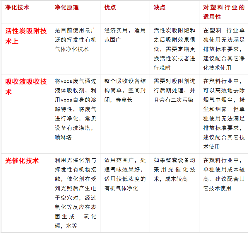 从以上分析可以看出,对于塑料造粒废气处理,比较适用的净化技术是活性炭吸附技术、喷淋吸收技术、光催化氧化技术和等离子净化技术。